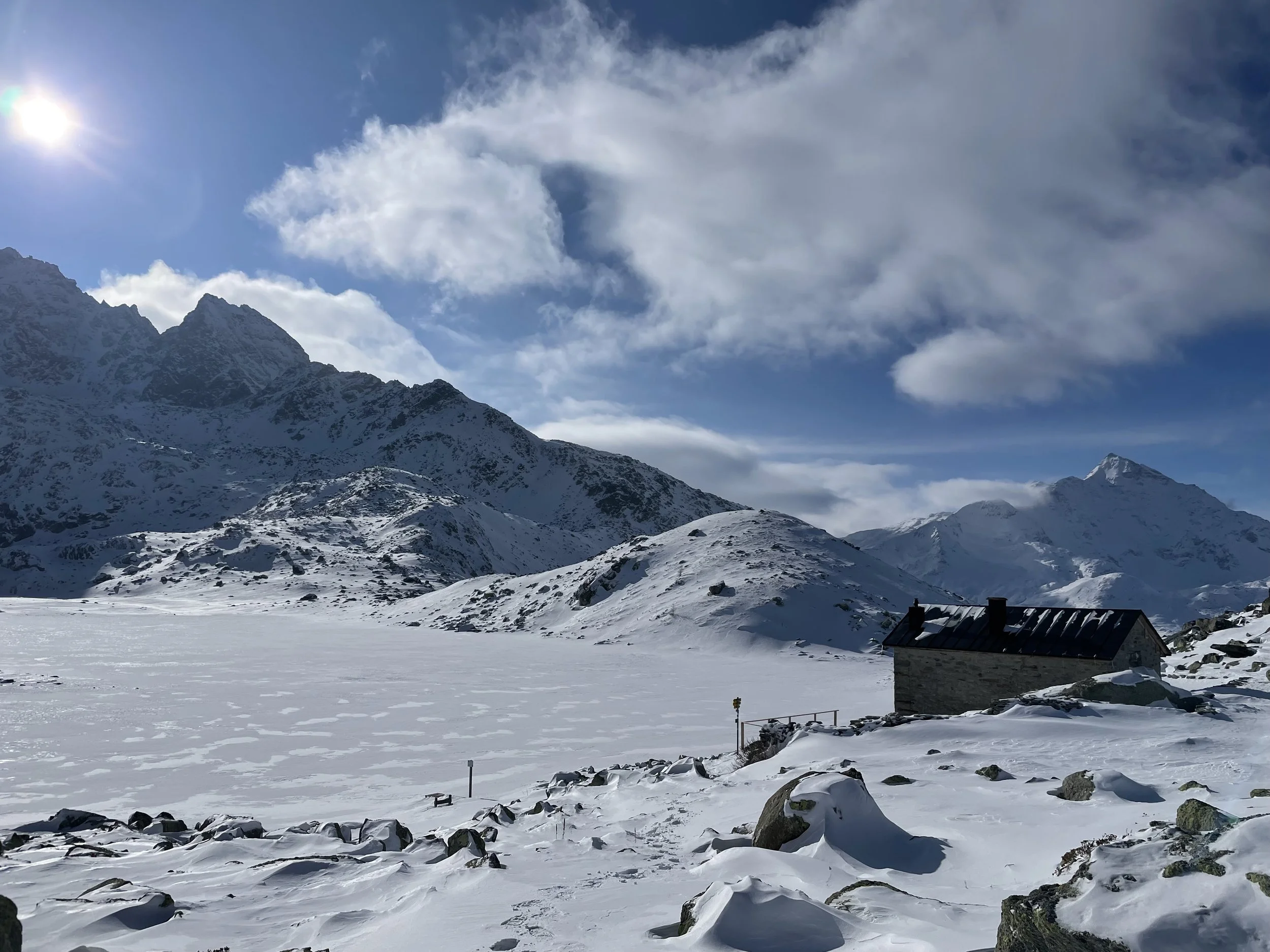 Leise knirscht der Schnee unter den Schuhen, während wir in Splügen starten. Durch den stillen Lärchenwald führt der Zickzackweg sanft bergauf, Schritt für Schritt dem Winter entgegen. Oben öffnen sich die verschneiten Surettaseen, umrahmt von schroffen Gipfeln. Weite Blicke zu Teurihorn, Tambo und Rothorn begleiten uns, bevor wir im Pulverschnee wieder talwärts gleiten.